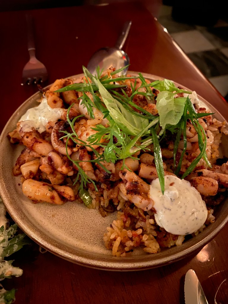 Luckily we had one of our sons with us so we were able to order a good sampling of dishes to share. The interior of the restaurant is really quite fab, but we opted to sit in their rather luxurious outside accommodation in light of the Omicron spread.