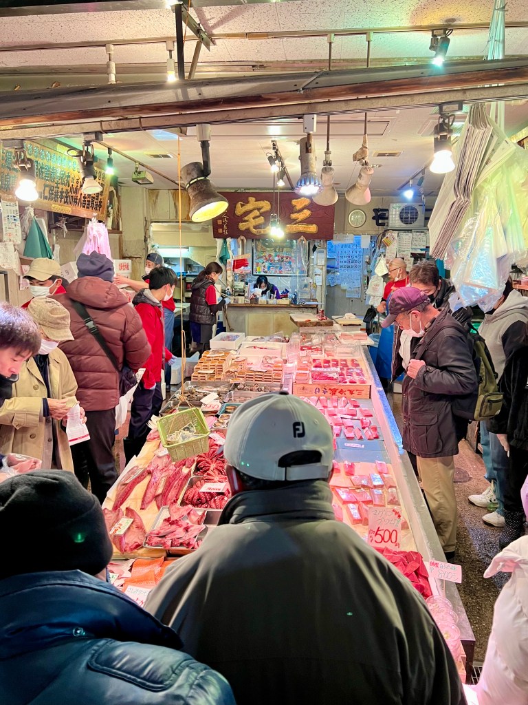 While the bed was incredibly comfortable, we were not successful in sleeping past 4:30 am, so we decided to get ourselves outside and go explore the Tsujiki Outer Fish Market which was walkable from our hotel. This area used to surround the Tsujiki Wholesale Fish Market where one could witness the Tuna Auction on a daily basis, but that has since moved to the Toyosu Market in another area in the city. Currently tickets to the Tuna Auction are offered on a lottery basis, but alas it was not happening during the New Years Holiday.