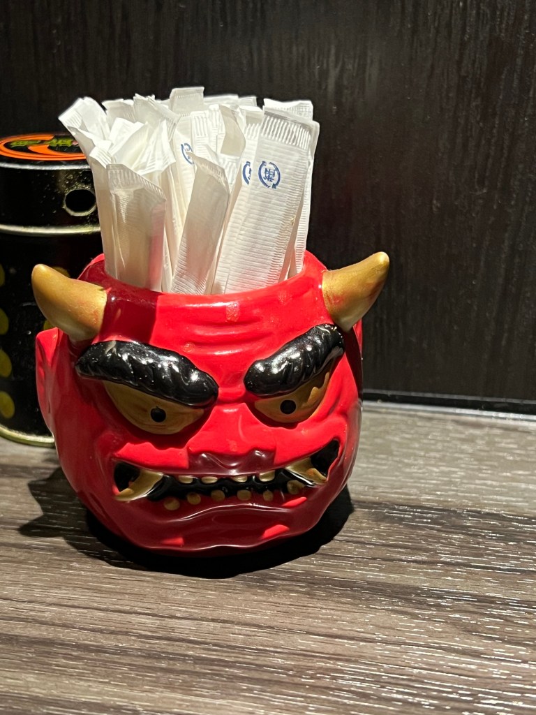 Following our dose of Couture we made our way back to the Shangri-La, had a quick snack in the Horizon Club and then packed up our suitcases. Upon checking out we asked the hotel to store our bags until our car came to take us to the airport. We did some more wandering and shopping (Hankyu Men’s Store was a particularly successful stop) and then my guys voted for Ramen for dinner. We happened upon Kikanbo which prides itself on super fiery Ramen which delights all your senses. Coincidently once we were there I recognized that it had been featured on the Tokyo episode of Somebody Feed Phil. Upon arrival we placed our order at the ticket vending machine outside the shop. We seemed to arrive just in time, there were about 15 people who lined up behind us.