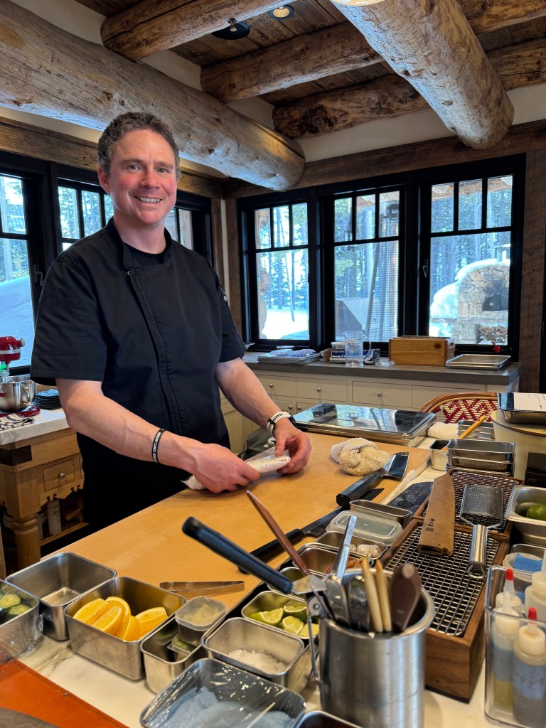The final meal of the trip before we headed back East may have been the most impressive. Bozeman native Jaison LeRoy is an outstanding sushi chef who creates a mind blowing Omakase experience in your home. Trained in Japan and logging experience at the Noma pop-up in Kyoto he is the real deal. After meeting him at a friend’s dinner party I couldn’t wait to plan a special event of my own that featured his artistry, and we were not disappointed. He and his staff (Bob and Sierra) allowed us to sit back and entertain our guests with no responsibility other than enjoying ourselves.