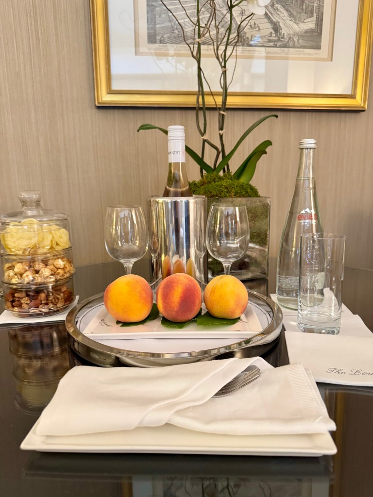 We arrived at the hotel mid-afternoon, and while our room was ready we were late for an engagement downtown so we dropped our bags and didn’t return until just before dinner. When booking I opted for a one bedroom suite, and that is exactly what I received, sadly no upgrade as the hotel was full, primarily it seemed with folks going to the US Open (judging by the number of people decked out in tennis clothes we encountered at breakfast and in the elevator). Upon initial inspection our accommodation was spacious, quiet, and a bit dull, with the fireplace being a highlight. The option exists to have the fire lit upon request, but only once autumn begins as it seems there are no fires to be lit in the summer months. The peaches were a tasty (and attractive) welcome amenity as were the accompanying salty snacks. The fresh flowers too made it seem quite homey but the one major miss in my book was the lack of an espresso/coffee maker. Initially I thought is was surely hidden away somewhere (the kitchenette would have been a logical choice) but I failed to successfully locate it.