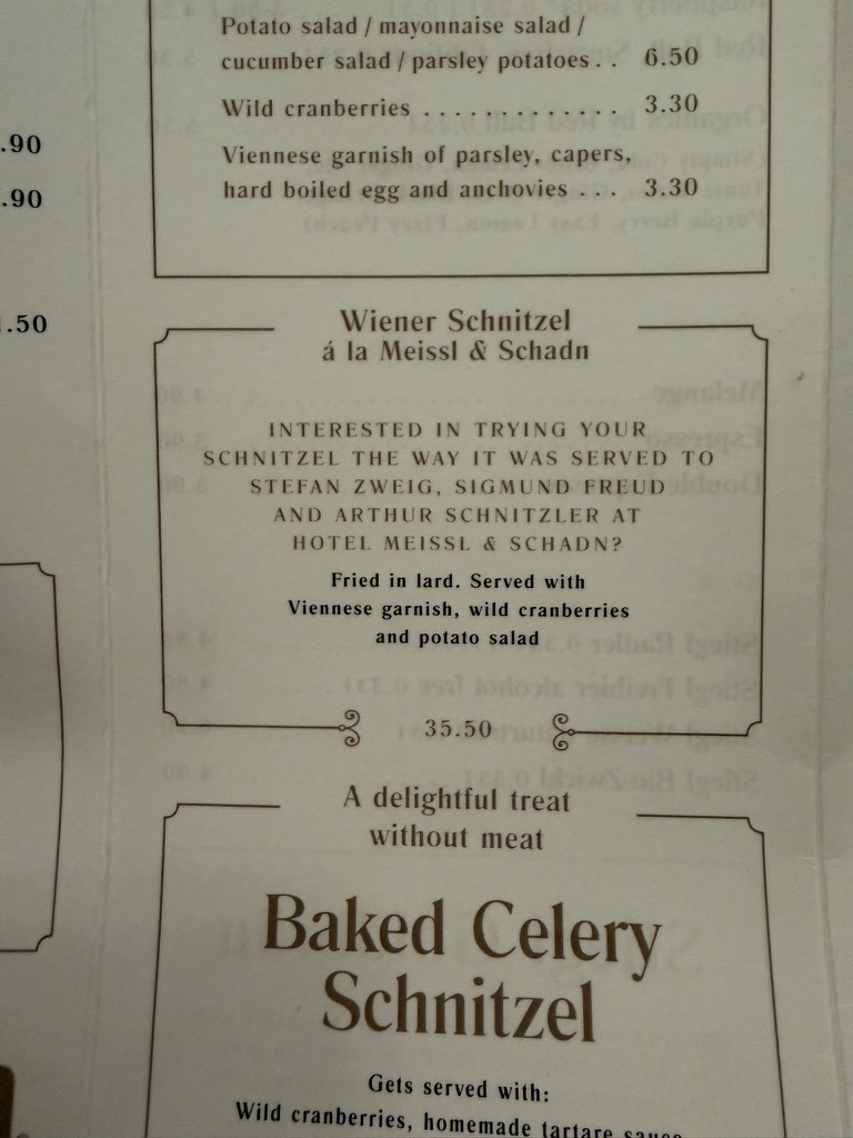 When in Austria you MUST dine on Schnitzel and we did so at Meissl & Schadn which also has a branch in Vienna. To put it bluntly, these folks are commited to Schnitzel, and you have the option of ordering in three different ways. As it happened we almost walked out prior to ultimately being seated but are grateful we didn’t because the meal was delish.
