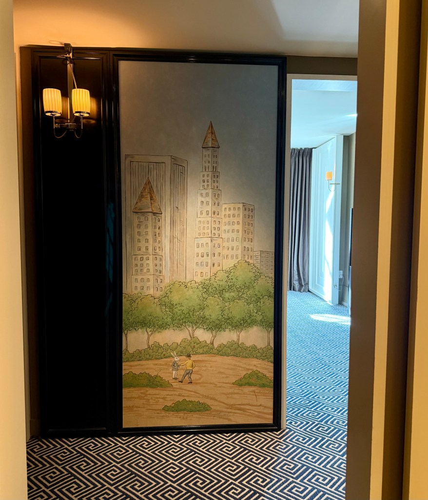 After a very pleasant reception and check-in we were escorted up to our suite (714) to get a quick tour. I had carefully viewed photos of the different options to be sure that the accommodation I chose appeared fresh and updated, and thankfully in real life it did not disappoint. The first glimpse of our entry was an illustration (reproduction) of one of Ludwig Bemelmans‘ iconic drawings, and that same image graced the interior of our suite along with other drawings- pure whimsy. The set-up was similar to a small apartment and every aspect seems to have been recently refreshed. I am not sure about the other rooms/suites, but ours was not tired at all.